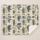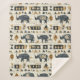 Bold tribal rhino pattern blanket featuring distressed black rhinoceros silhouettes paired with geometric mudcloth-style motifs in warm tan and charcoal on a textured beige background. A rugged, earthy design ideal for safari enthusiasts, boho decor lovers, and wildlife-inspired style fans.