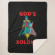 Este cobertor tem as palavras Soldado de Deus em uma impressão ousada letra mais letras vermelhas com um soldado em armário cheio ou segurando uma espada mais escudo no centro com um tema baseado na fé. Este cobertor apresenta uma imagem vívida de um lado e o Sherpa mais suave disponível no reverso, feito de 100% de poliéster e impressão de vison com suporte ultra-soft sherpa.