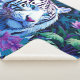 tigre branco de olhos azuis em folhas tropicais e flores roxas AI Art por minx267
