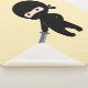 Ninja de desenho animado, bonito mas zangado, vestido de preto, está segurando uma tradicional espada japonesa de katana.
