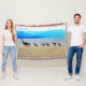 Os gansos do Canadá são escoltados ao longo da costa do lago Pend Oreille, em Idaho norte, por um adulto. O texto personalizável que lê "IDAHO" também é exibido. Esta é uma cena típica no Parque City Beach, em Sandpoint.