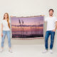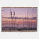 Um belo pôr do sol roxo e laranja sobre o oceano Atlântico e a Aveia do Mar e a grama balançando suavemente em primeiro plano.