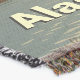 Em algum lugar do interior do Alasca um alce atravessa uma lagoa em uma tarde de outono ensolarada. À medida que o final do ano se aproxima, a luz tomou o típico tom amarelado que faz tudo parecer um pouco frágil. O sol está caindo entre as montanhas no fundo. O texto personalizável lendo "Alaska" também é exibido.
