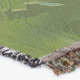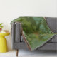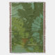 O trabalho artístico original do HomeWare neste cobertor de linha usa uma fotografia original para criar a ilusão do tecido retrô ou do de imagem. Na foto, folhas verdes e profundas tropicais, em luz solar brilhante e sombra profunda, se espalham sobre um fundo de céu azul profundo. O design tem uma tonalidade verde antiga sobre ele, e uma textura que lhe dá um aspecto de tecido de seda antiga.