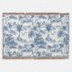 A imagem retrata um padrão clássico de mosaico de Jouy, caracterizado por cenas detalhadas em azul sobre fundo branco. Apresenta paisagens tropicais com palmeiras exuberantes, terreno rochoso e massas de água serenas. Há elementos como cabanas pequenas, pássaros em voo, e ilhas distantes, dando ao design uma sensação idílica e pacífica. O padrão é intrincado e evoca uma sensação de elegância pastoral tradicional muitas vezes associada às artes decorativas francesas.