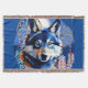 Lindo Lobo com olhos amarelos profundos, com Sonhadores Nativos Americanos, numa Paisagem Azul Selvagem e Lua Cheia. Design do logotipo original redondo vetor isolado em branco Copyright BluedarkArt The ChameleonArt.