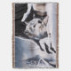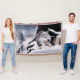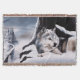 Um lobo na neve do inverno com um castelo atrás do lobo.
