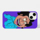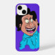Este trabalho de arte do cobrir iPhone apresenta uma vibrante caricatura cartoonista de um homem com traços faciais exagerados, incluindo olhos abarrotados, um sorriso largo e um nariz proeminente. O personagem é representado com humor em uma camisa turquesa brilhante, colocada contra um fundo roxo arrojado. O estilo é brincalhão e exagerado, com traços grossos e cores vivas em preto, dando à peça uma sensação viva e enérgica. O design geral é branco, fazer-o como acessório atraente e divertido.