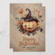Feliz cartão de Dia das Bruxas com uma abóbora assustadora vestindo um chapéu preto e rodeado por flores em frente a uma grande teia. Personalize facilmente este cartão de Dia das Bruxas com seu nome e texto de família.