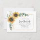 Um moderno Floral de Girassol salve o anúncio da data com este modelo bonitinho com um belo buquê floral rústico, com a moderna tipografia simples sobre fundo branco. DICA: Cartões de suíte de casamento iguais, como RSVP, programas de casamento, banners, tapeçarias, etiquetas de presentes, placas e outras pegadas de casamento e guloseimas estão disponíveis na coleção abaixo com esta design.