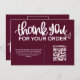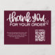 Expresse sua gratidão com nosso cartão burgundy com Código QR "Agradecemos Sua Compra" Inserção no Pacote. Seus clientes escaneiam o código QR para revelar uma mensagem sincera, ofertas exclusivas ou uma nota de agradecimento personalizada, adicionando um toque especial à experiência de compra do seu cliente. Mostre apreço e fomente a lealdade com essa inovadora e atenciosa inserção no pacote.