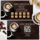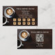 Cartão de visita de fidelidade com cappuccino e espresso sobre fundo de madeira escura. As imagens de fundo do número de socch estilizado dourado e rosa estão em um arquivo separado e você pode excluí-las se preferir campos personalizados. A imagem cardíaca na frente também é opcional. Na parte traseira, é adicionado um modelo de código QR fácil de personalizar.