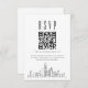 Um cartão de código QR rsvp de casamento com uma lindíssima linha do horizonte estilizada representando a cidade de Chicago. Substitua o código QR por um link para seu site para ajudar a facilitar a resposta ao evento de casamento para seus futuros convidados.