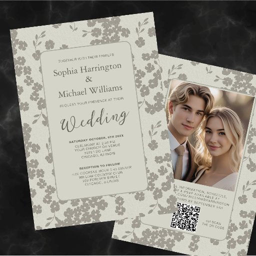 Enrole seu dia de casamento em um na moda moderno modelo de convite elegante floral, com arte original criada exclusivamente por Toni. As cores principais são cinzentos macios e bege. Este modelo oferece um layout totalmente personalizável que permite que sua história brilhe em todos os detalhes. No verso você pode adicionar sua fotografia favorita, além de um código QR incluído! Este design permite adicionar todos os detalhes do seu dia especial. Clique em "Personalizar este design" e, em seguida, poderá adicionar os seus próprios detalhes. Para alterar as fontes ou as cores da fonte, clique em "Editar usando a Ferramenta de Design". Clique em "Editar texto" com o lápis (no canto superior direito) para alterar o texto. Para alterar a cor da fonte, clique em "Cor".