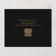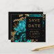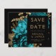 Este elegante e melancólico casamento "Salve o cartão da data" apresenta um buquê floral romântico e luxuoso em turquesa com folha de ouro e folhagem brilhante num fundo negro. Personalize o texto dourado em fontes na moda em um retângulo preto e adicione um breve texto adicional no verso, juntamente com um código QR para ajudar os convidados a visitar o site do seu casamento.