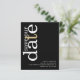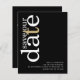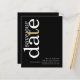 Um valor para o alternativo do ORÇAMENTO em tamanho menor de 4,5 x 5,6" de semirbrilho de 110 lbs, que é de espessura semelhante a um cartão postal (no entanto, não é adequado para uso como cartão postal). POR FAVOR, OBSERVE QUE HÁ UM convite por folha. Código QR de Orçamento Texto Dourado Branco Data de Salvamento Preto. Adicione seu código QR ao seu site de casamento no verso substituindo o código QR na amostra. Você pode criar códigos QR gratuitamente on-line. Basta pesquisar "Criador de código QR" e muitas opções surgem para criar gratuitamente. Um na moda tipográfico moderno para convidar sua família e amigos para salvar seu encontro, com a organização Save Our Date em grande tipografia rotacionada e para o lado esquerdo no topo em branco, com uma letra dourada "t" sobre um fundo de preto. Personalize facilmente o resto do texto.