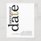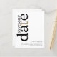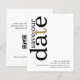 Um valor para o alternativo do ORÇAMENTO em tamanho menor de 4,5 x 5,6" de semirbrilho de 110 lbs, que é de espessura semelhante a um cartão postal (no entanto, não é adequado para uso como cartão postal). POR FAVOR, OBSERVE QUE HÁ UM convite por folha. Código QR de Orçamento Texto Preto Dourado Branco Salvar a Data. Adicione seu código QR ao seu site de casamento no verso substituindo o código QR na amostra. Você pode criar códigos QR gratuitamente on-line. Basta pesquisar "Criador de código QR" e muitas opções surgem para criar gratuitamente. Um na moda tipográfico moderno para convidar sua família e amigos para salvar seu encontro, com a organização Save Our Date em grande tipografia rotacionada e para o lado esquerdo no topo, em preto, com uma letra dourada "t" sobre um fundo branco. Personalize facilmente o resto do texto.