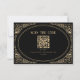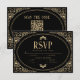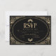 Um cartão rsvp de casamento moderno e chic com bordas faux gold deco art e fontes vintage em fundo preto com código QR para rsvp.