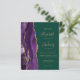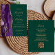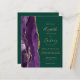 A borda esquerda apresenta uma borda agitada de cor púrpura, aparada com brilho dourado. O texto personalizável combina manuscritos dourados, placas de impressão e fontes itálicas em um fundo verde esmeralda. O verso fornece espaço para detalhes do casamento em um fundo verde esmeralda sólido, junto com um código QR que os convidados podem digitalizar para visitar seu site e RSVP, o que economiza o custo de imprimir e enviar cartões RSVP separados.