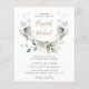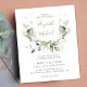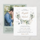 Um convite para casamento, amigável e econômico, com aquarelas de verde-sábio eucalipto verde, folhas loucas com sotaques dourados, tipografia moderna de cinza mole e seus nomes em um roteiro de ouro na moda. No verso, adicione sua foto e insira o endereço do site de casamento para criar um código QR para seus convidados digitalizarem para RSVP on-line e obter detalhes adicionais de casamento, como instruções e acomodações. Este papel semirbrilhante do orçamento é semelhante em peso ao papel fotográfico. Também está disponível uma versão maior do estoque de cartão tradicional 5x7 (mensagem para o link).