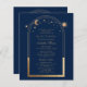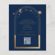 Célestial Blue Dourado QR Code Quinceañera Invices apresenta um elegante sol dourado, lua e estrelas com ouro em fundo azul. Dentro é a sua informação de convite da Quinceañera. No verso, adicione informações adicionais, como o site da Quinceañera e o código QR. Personalize editando o texto nas caixas de texto. Projetado para você pelo Evco Studio www.zazzle.com/store/evcostudio