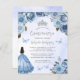 Este adorável convite da quinceañera mostra uma fronteira de rosas azuis com folhagem cintilante prateada em fundo azul de aquarela. Uma tiara prateada, uma menina de cabelo escuro em um vestido de princesa azul e pequenas borboletas azuis decoram o texto. A palavra "Quinceañera" e o nome do convidado de honra aparecem no elegante guião de escrita manual de cinzas prateadas, com o texto remanescente na fonte sans serif de cinzas. Adicione texto adicional no verso, juntamente com um código QR para ajudar seus convidados a visitar seu site quinceañera e RSVP on-line.
