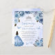 Este adorável convite da quinceañera mostra uma fronteira de rosas azuis com folhagem cintilante prateada em fundo azul de aquarela. Uma tiara prateada, uma menina de cabelo escuro em um vestido de princesa azul e pequenas borboletas azuis decoram o texto. A palavra "Quinceañera" e o nome do convidado de honra aparecem num elegante guião azul de escrita manual, com o texto remanescente na fonte serif cinza. Adicione texto adicional no verso, juntamente com um código QR para ajudar seus convidados a visitar seu site quinceañera e RSVP on-line.