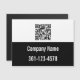 A parte superior é branca. A placa de ímã tem uma imagem de exibição que você pode substituir pelo código QR apropriado. A parte inferior é preta e tem texto de exibição branco que você pode editar para digitar o nome da sua empresa e o número de telefone. Todo o texto pode ser editado ou excluído.