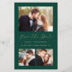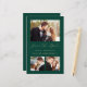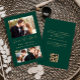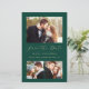 Essa simples e minimalista placa Save the Date apresenta uma colagem de fotos, com uma foto horizontal no topo e duas fotos quadradas abaixo. Entre as fotos de cima e de baixo, as palavras "Salvar a Data" aparecem em um elegante roteiro de manuscrito dourado, seguido dos nomes dos casais, da data do casamento e da cidade em sans serif em um fundo verde esmeralda. Adicione uma mensagem mais detalhada com informações adicionais na parte traseira, juntamente com um código QR para ajudar seus convidados a visitar o site do seu casamento.