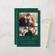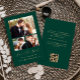 Essa simples e minimalista placa Save the Date apresenta uma colagem de fotos, com uma foto horizontal no topo e duas fotos quadradas abaixo. As palavras "Salvar a Data" aparecem num elegante guião de escrita manual dourada, seguido dos nomes dos casais, da data do casamento e da cidade em sans serif, num fundo verde esmeralda. Adicione uma mensagem mais detalhada com informações adicionais na parte de trás, juntamente com um código QR para ajudar seus convidados a visitar o site do seu casamento.