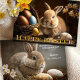 Cartão de felz pascoa com pintura clássica de coelho com ovos pintados. Com espaço para seus próprios textos ou (bíblia) citações no verso.