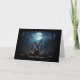 Este cartão de Halloween apresenta um design caprichoso, mas ligeiramente assustador, perfeito para a época. A imagem central é um coelho escuro e sombrio com olhos laranja brilhantes, sentado no meio de uma floresta misteriosa sob a luz da lua cheia. O coelho está segurando um pedaço de candy corn, cercado por mais candy corn espalhado pelo chão da floresta, adicionando um toque lúdico ao cenário sombrio.
