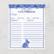 Personalize estes cartões de receita com o nome da cozinha de um cozinheiro especial! Estes cartões são decorados com os tradicionais motivos azul e branco do porcelana Blue Willow, com uma borda superior decorativa e um coelho decorado com flores, todas minhas interpretações pintadas à mão. A borda se assemelha a um esmalte de cerâmica trincado. Os cartões são revestidos na frente e atrás para facilitar a escrita da sua receita. É fácil personalizar estes com um nome, usando o modelo de texto e o menu de edição. Este padrão de porcelana popular é querido e atemporal. Design caprichoso e único de Tuzi Williams.