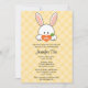 Um coelhinho fofo segura uma cenoura em forma de coração entre suas patas nesses bonitos lugares neutros de gênero Ano dos convites para bebês do Coelho com um fundo amarelo de pok a dot. Design e trabalho de arte © Chrissy H. Estúdios, LLC. Todos os direitos reservados.