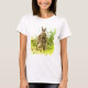 Esta camiseta doce apresenta um coelho marrom giro na grama verde.