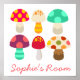 Um design adorável de cogumelos coloridos engraçados. Esta ilustração de crianças bonitinhas é perfeita para o quarto de uma menina. Tema de padrão colorido do cogumelo. A diversão das crianças. Nome personalizado para o quarto de criança.