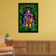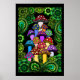 Um poster com cogumelos psicodélicos coloridos cercados por paisley verde e mandalas verdes.