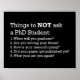 Poster engraçada com uma lista de cinco coisas para não pedir a um aluno de doutorado. 1. Quando você vai formando? 2. Você está escrevendo sua tese? 3. Como vai sua pesquisa? 4. Seu artigo já foi publicado? 5. Em que ano você está de novo?