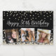 Design de aniversário elegante e personalizado com confetes de ouro e prata sobre um fundo preto, tipografia moderna com as palavras "Feliz 50º Aniversário", seu nome e data de nascimento (em prata) e três das suas fotos favoritas emolduradas em folha de prata.