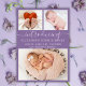 Cartões de Colagem Fotográfica com Anúncio de Nascimento Roxo 3. Anúncio de nascimento elegante com 3 fotos de seu bebê favorito na frente, com um bonito texto escrito à mão "apresentando" em um roteiro suave de caligrafia com fonte de rabo-de-banho em fundo de cor roxa. Adicione o nome do seu bebê à frente e à natalidade. Na parte de trás, uma foto vertical do bebê em um plano de fundo lilático macio de pontos brancos. Você pode personalizá-lo facilmente.