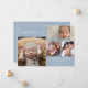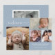 Anuncie a chegada do seu bebê menino com este moderno anúncio de nascimento duplo lado azul poeirado. A frente apresenta uma colagem de quatro fotos de suas fotos favoritas do bebê com boas-vindas em uma tipografia de script. Personalize com o nome do seu bebê, data de nascimento, estatísticas de nascimento e nomes dos pais.