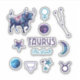 Celebre a força estável e fundamentada de Touro com esta coleção de adesivos do zodíaco lindamente detalhada. Com arte celestial do Touro, a constelação de Touro, símbolo do zodíaco, símbolo do elemento Terra e símbolo do planeta regente Vênus, este design é rodeado por luas sonhadoras, planetas e estrelas para um sentimento cósmico mágico.