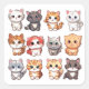 Esta imagem é uma continuação da série deliciosa de adesivos felinos, com uma adorável variedade de gatinhos de desenho animado em várias poses brincalhão. Cada gatinho tem seu próprio padrão de cor e expressão únicos, dando vida à natureza divertida e curiosa desses queridos animais de estimação. Do olhar inquisitivo de uma cinza apresentada à doce inclinação da cabeça de um gatinho laranja e branco, esta coleção captura a essência animadora e alegre de gatinhos que encanta entusiastas de gatos em todo o lado.