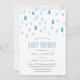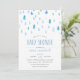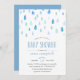 Os convites de chuveiro de bebês de cor d'água doce apresentam queda de gotas de chuva em tons de pastel e azul de lapis. Personalize com seus detalhes de chá do bebê embaixo usando os campos de modelo. Cartões invertidos a azul sólido.