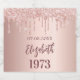 Uma etiqueta de garrafa para uma festa de aniversário cinquentenária e glamourosa (ou qualquer idade) com as raparigas. Um fundo rosa dourado com uma elegante brilha rosa dourada escura, pintura gotejando. O texto: O nome é escrito em ouro rosa escuro com um grande estilo escrito à mão moderno. Personalize e adicione uma data, nome e ano de nascimento.