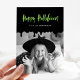 Cartão com fotos "Feliz Dia das Bruxas" em letra de verde limão. A parte superior do design apresenta um gotejamento de sangue preto escondido na sua foto mostrada abaixo. Personalize a frente do maldito cartão de Halloween com seu nome. A parte traseira da placa apresenta um plano de fundo preto manchado.