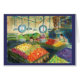 Dois fornecedores de produtos empilham cuidadosamente e organizam a fruta e os vegetais coloridos em sua banca. Dois conjuntos de escalas estão em harmonia com os números. Em acrílico e pastel em papel.