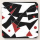 Várias formas geométricas brancas e vermelhas estão espalhadas sobre um fundo preto, criando um forte contraste. Algumas formas são interconectadas com linhas brancas finas, e pontos vermelhos adicionam um pop de cor à composição.
