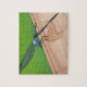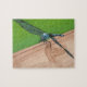 A pintura de uma libélula azul sentada sobre um trilho de madeira, apreciando o sol, é impressa em quebra-cabeça de serra. Crianças para adultos podem desfrutar dessa atividade divertida.