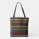 Carry style with this tote bag featuring horizontal lines in muted purple, yellow, green, orange, blue, maroon, red, and beige on a sleek black background. Each line varies in thickness for a modern, eye-catching look. Perfect as part of a matching gift set with mugs and throw pillows, making it a complete stylish collection gift for friends, family, or yourself.